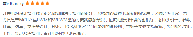 开关电源设计培训找了很久找到端海,培训的很好,老师讲的各种电源案例很实用,老师经验非常丰富,尤其是带MCU产生PWM和SVPWM型的方案我感触最深,恒流电源设计讲的也很好,老师从设计、参数计算、仿真、变压器设计、EMC、PCB,SPICE等等问题讲的很透彻,有板子实物实战演练,特别贴合实际工作。经过系统培训,设计电源心里更有底了。